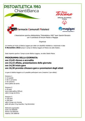 Sabato 5 Novembre presso il Campo Scuola di Pistoia andrà in scena un meeting riservato esclusivamente ad atleti con disabilità intellettiva e relazionale. L’organizzazione sarà a cura della nostra società con il prezioso contributo di Farcom Pistoia e di Magigas.